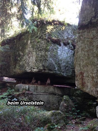Auf einem Höhenrücken kam dann die Abzweigung ,300 Meter, zum Naturdenkmal ''Urselstein''. 600 Meter extra?, ''dass machen wir doch'', also ging es bis zum Urselstein um ein paar Bilder zu machen. Grosse beeindruckende Buntsandsteine offenbarten sich uns, und in einem Felsspalt waren dann auch Steinmännchen aufgestellt. Kunstwerke von Kindern? Wer weiß?