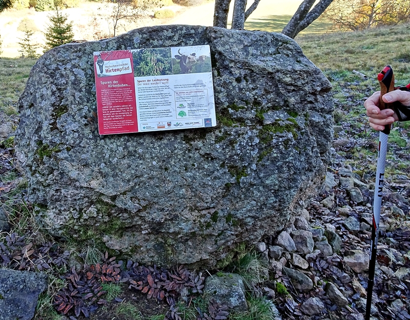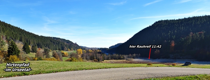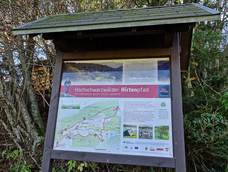 Der Hochschwarzwälder Hirtenpfad führte uns von hier aus, über stetig ansteigenden Wegen entlang von, mit Rauhreif belegten, Wiesen. Die Wege im Wald sind mit Baumwurzeln durchzogen. Wir waren froh das wir den Wanderweg links rum und steigend gegangen sind und nicht die empfohlene Wegrichtung, denn, bei feuchten Wegen und feuchten Baumwurzeln ist es nicht grad ratsam abwärts zu gehen. Obwohl, es sind uns einige Wanderer entgegen gekommen die die empfohlene Wegrichtung gegangen sind.