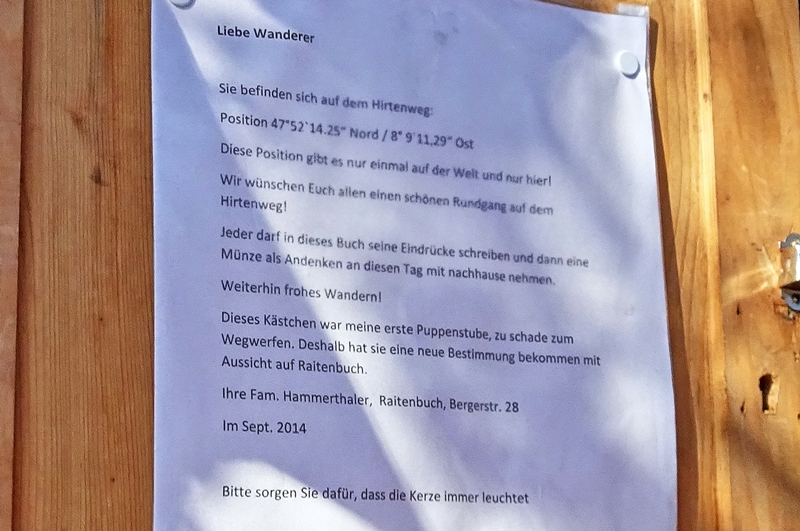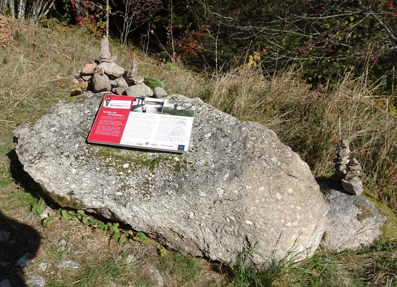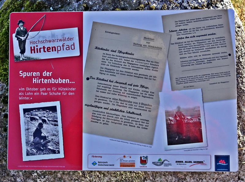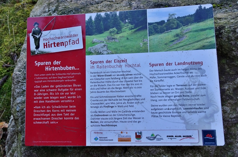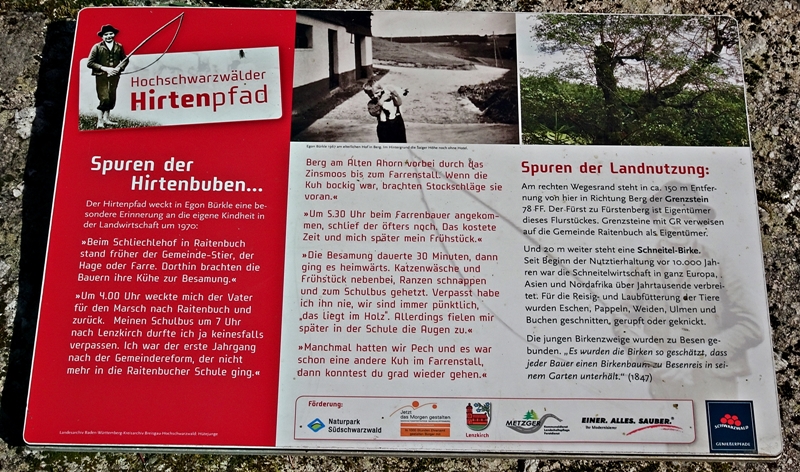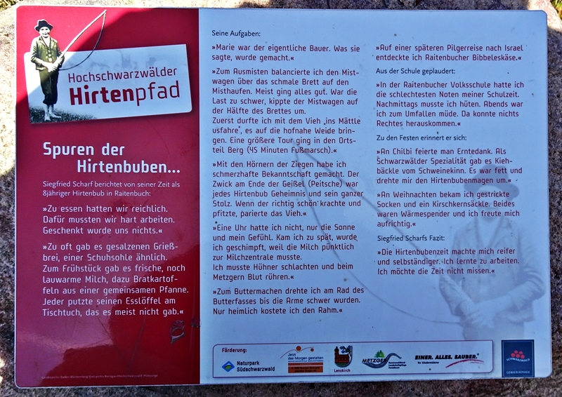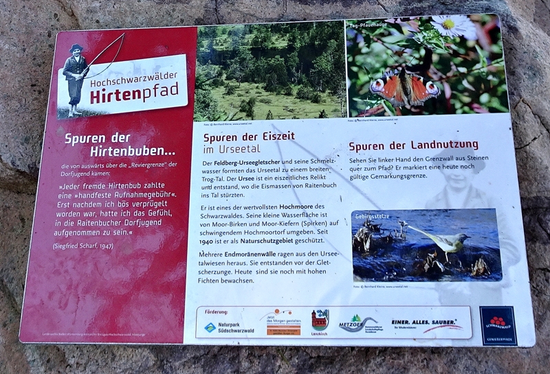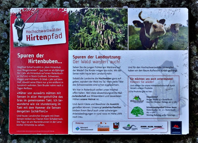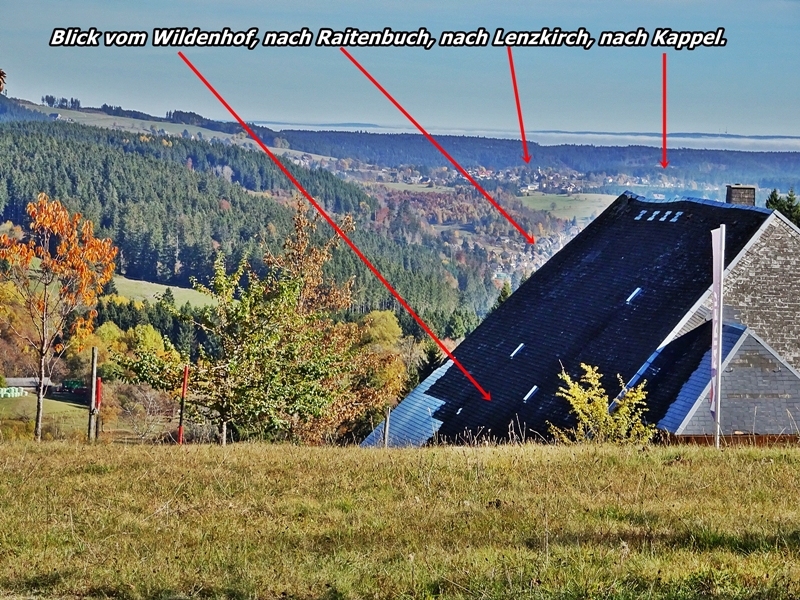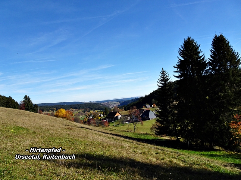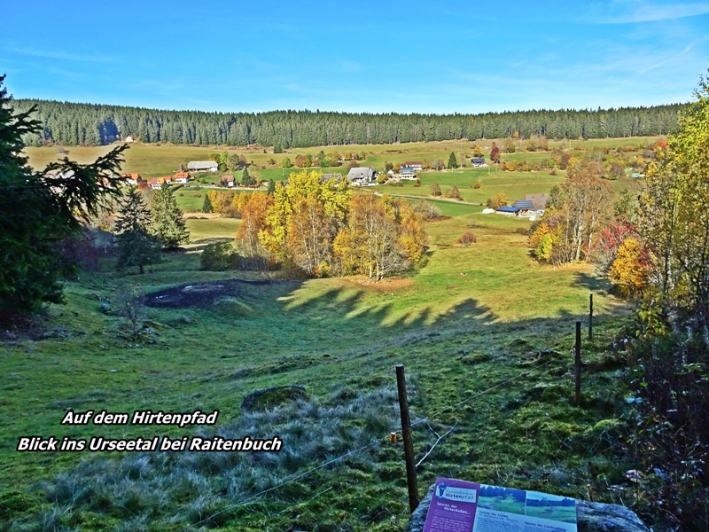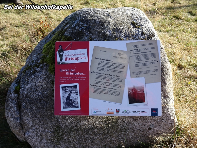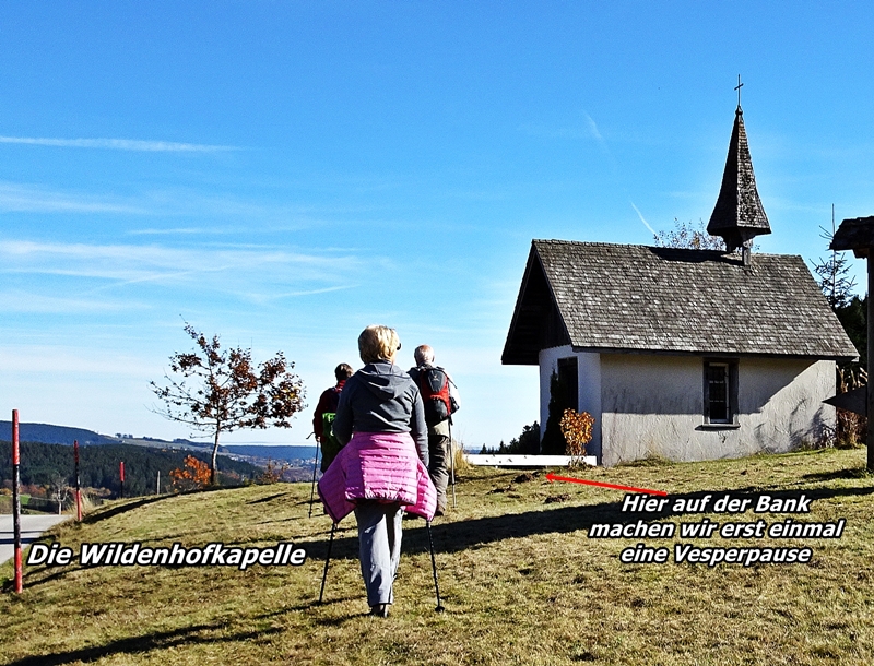 Mit herrlichen Blicken auf Schwarzwälder Höfe, über Raitenbuch, auf die Sonnen beschienene ''Sommerberg Seite'' und über das Urseetal erreichten wir den Wildenhof. Unterwegs stießen wir immer wieder auf Felsen mit Hinweisschildern auf den Hirtenpfad und Erklärungen wie die Hirtenbuben behandelt wurden. Hier beim Wildenhof gibt es die Wildenhofkapelle, wo wir im Sonnenschein auf der Holzbank vor der Kapelle, (ein Überbleibsel vom Papstbesuch in Freiburg,) unsere Vesperpause eingelegt haben.