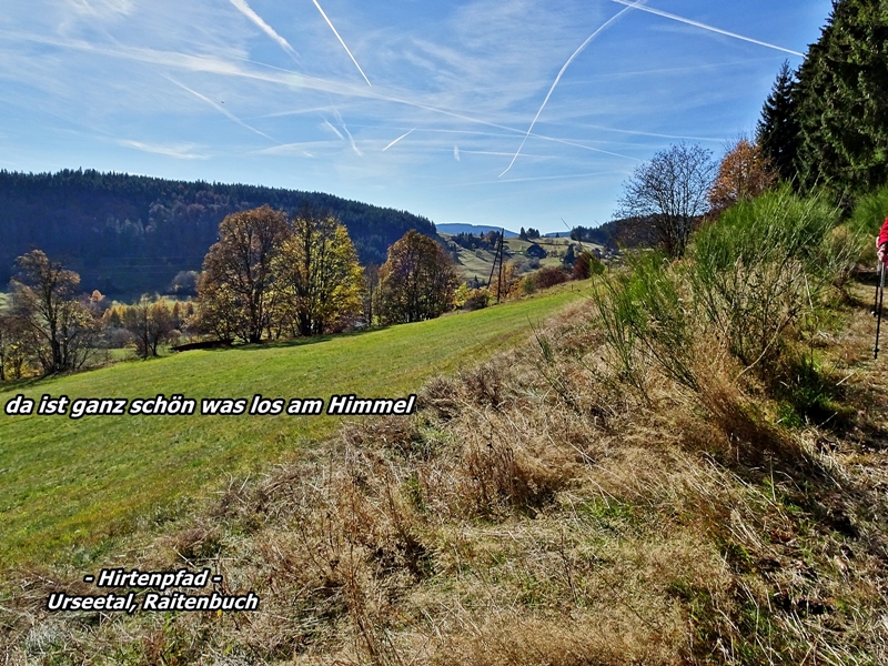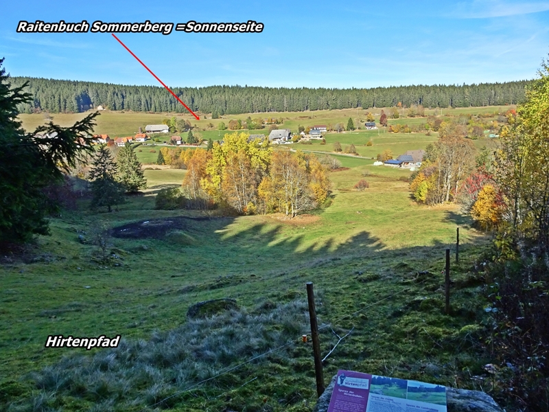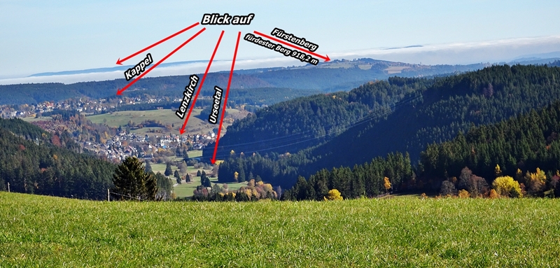 Nach unserer Pause ging es etwas abwärts und wir überquerten die Raitenbucher Strasse um dann wieder hinauf bis zur Sommerberg-Seite zu gelangen. Diese Seite hat die Begründung für ''Sommerberg'', denn es schien hier auf der ganzen Wanderstrecke die Sonne, außer der Weg führte mal durch den Wald. Hier auf der Sommerberg-Seite hatten wir tolle Sichten auf Raitenbuch, ins Urseetal, nach Lenzkich und Kappel ja sogar bis Fürstenbeg (Baar) bei Hüfingen.